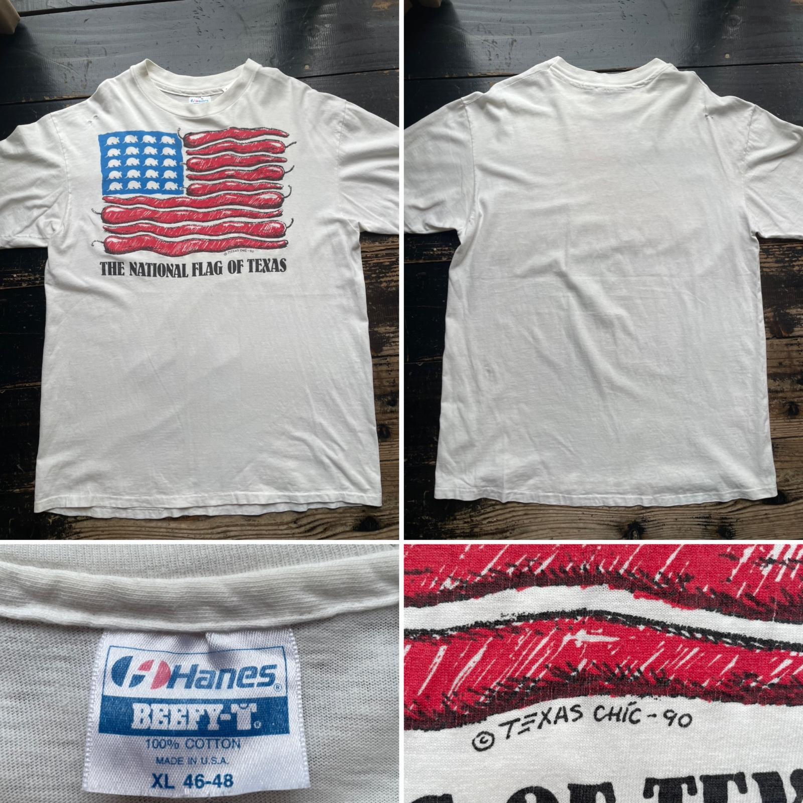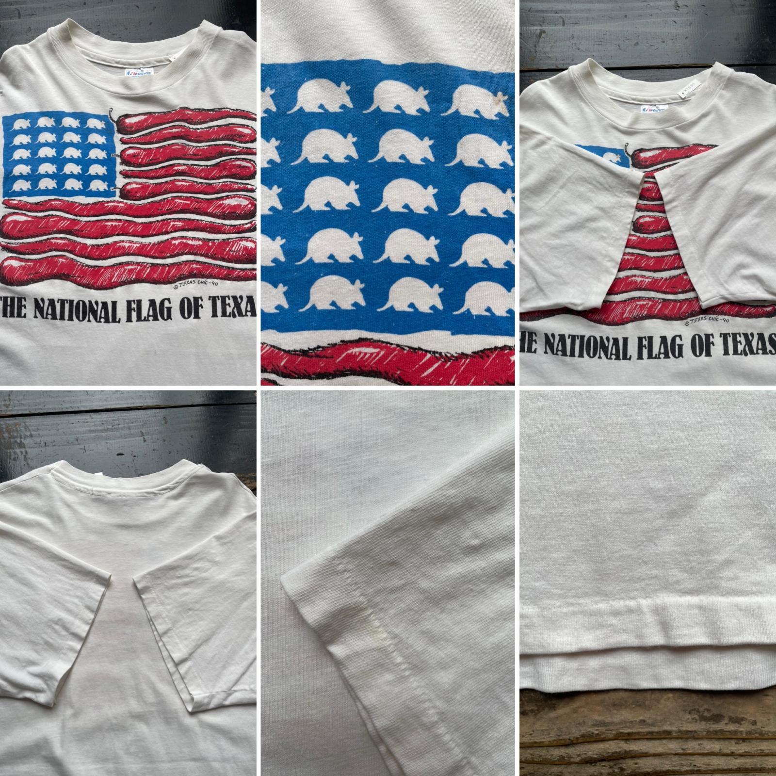 90年代のテキサスの変わった星条旗のデザインのTシャツ。ボディはHanes USA製 素材はコットン 袖と裾はシングルステッチ プリントは油性 アルマジロと唐辛子?の星条旗でしょうか?ボロいですがデザイン良いTシャツだと思います。