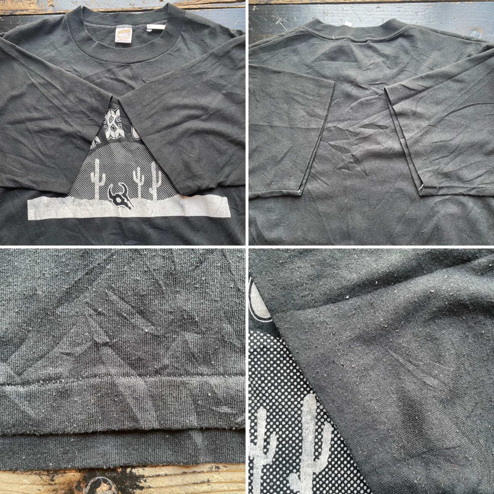 ダメージ:ダメージはプリント全体的に剥がれやヒビあります。全体的に毛羽立ち 毛玉感 色褪せあります。生地薄くなってますが手は透けないです。その他にもダメージ等ありますがご使用には問題ないです。