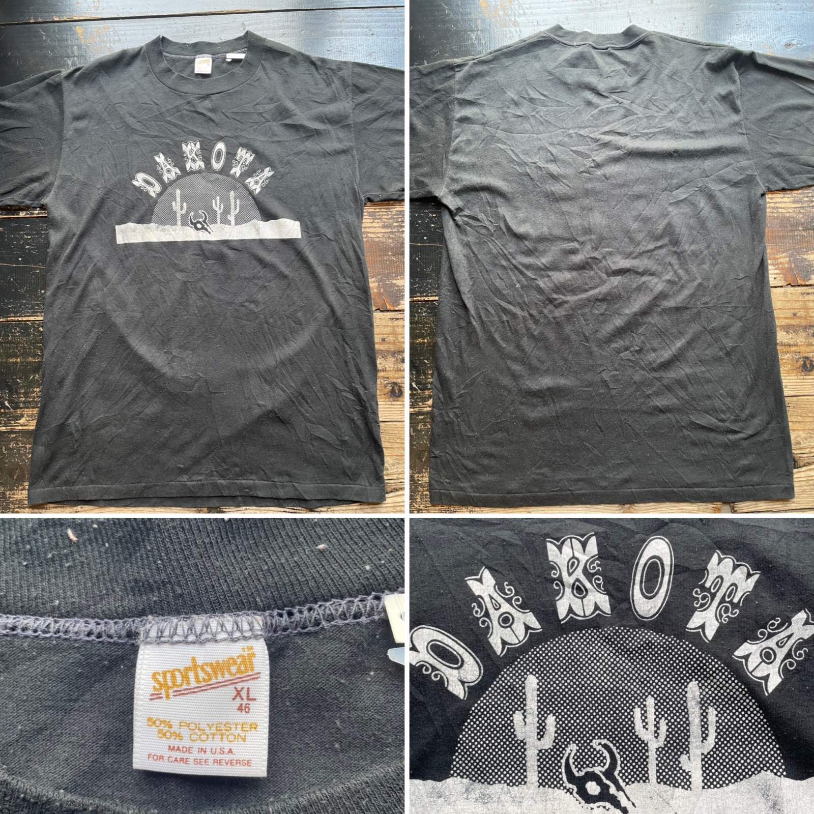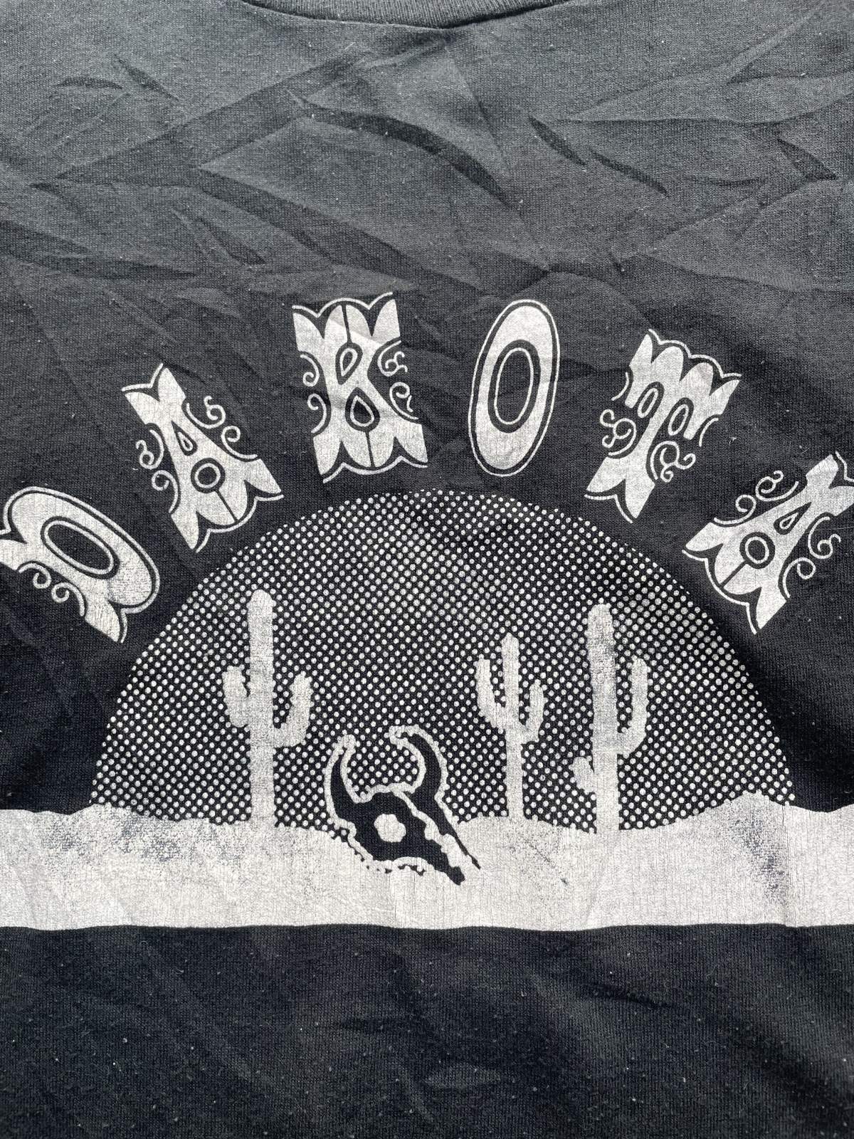 80年代のDAKOTAのTシャツ。ノースダコタもサウスダコタも何もないって事のプリントでしょうか?ボディはsportswear USA製 素材はコットン×ポリエステル プリントは油性 袖と裾はシングルステッチ 毛玉感ありますがプリントがシンプルで格好良く文字のデザインも良いと思います。