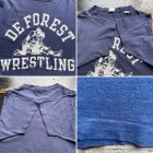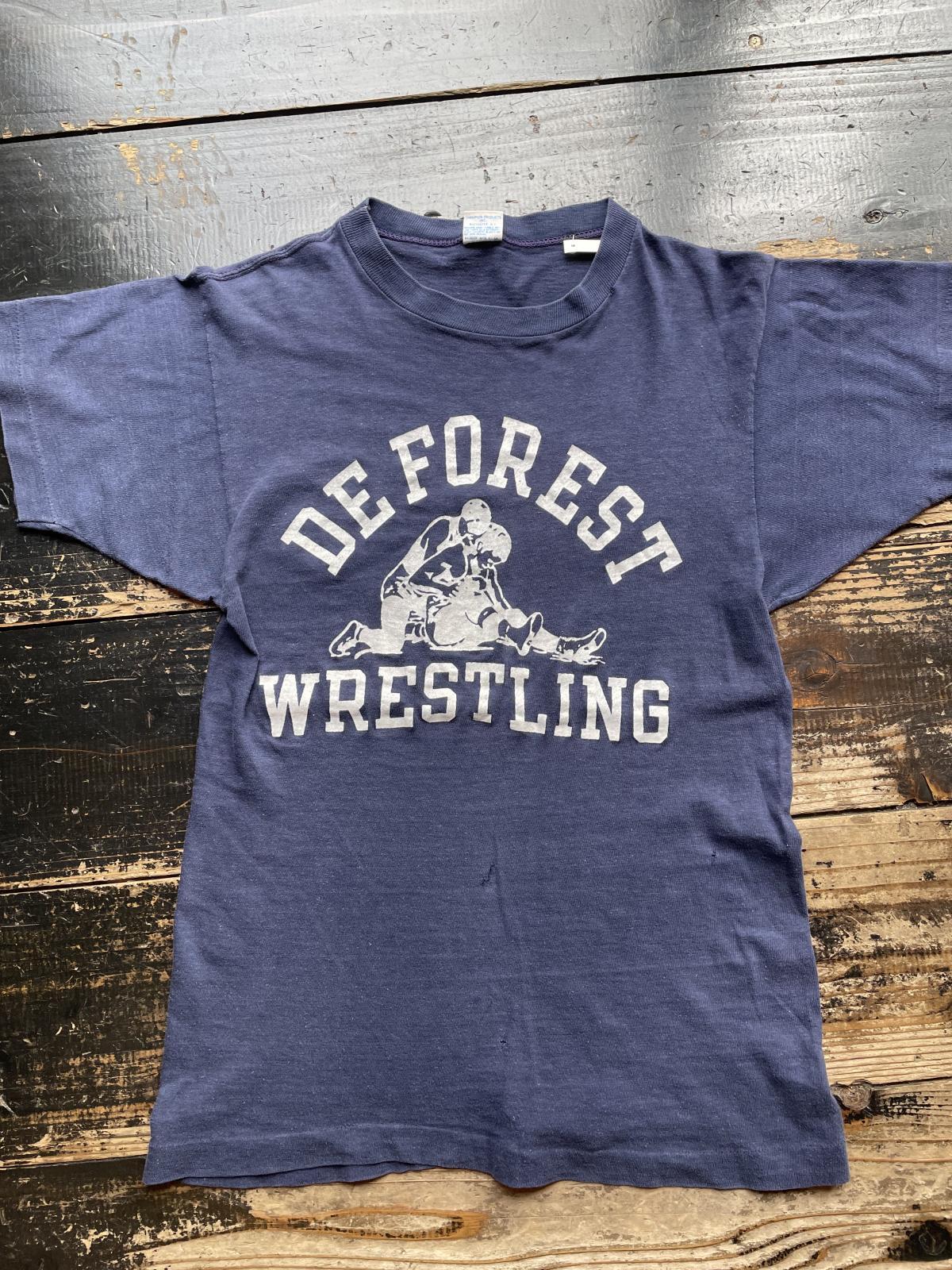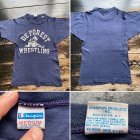 1970年代〜80年代のchampionのTシャツ。タグはバータグ USA製 素材はコットン プリントはラバーだと思います。色はネイビー 袖と裾はシングルステッチ サイズ表記Mですがだいぶ縮んでXS〜S位のサイズ感だと思います。 サイズ小さいので女性が着ても良いと思います。ダメージ等ありますが雰囲気良く古着らしいTシャツだと思います。