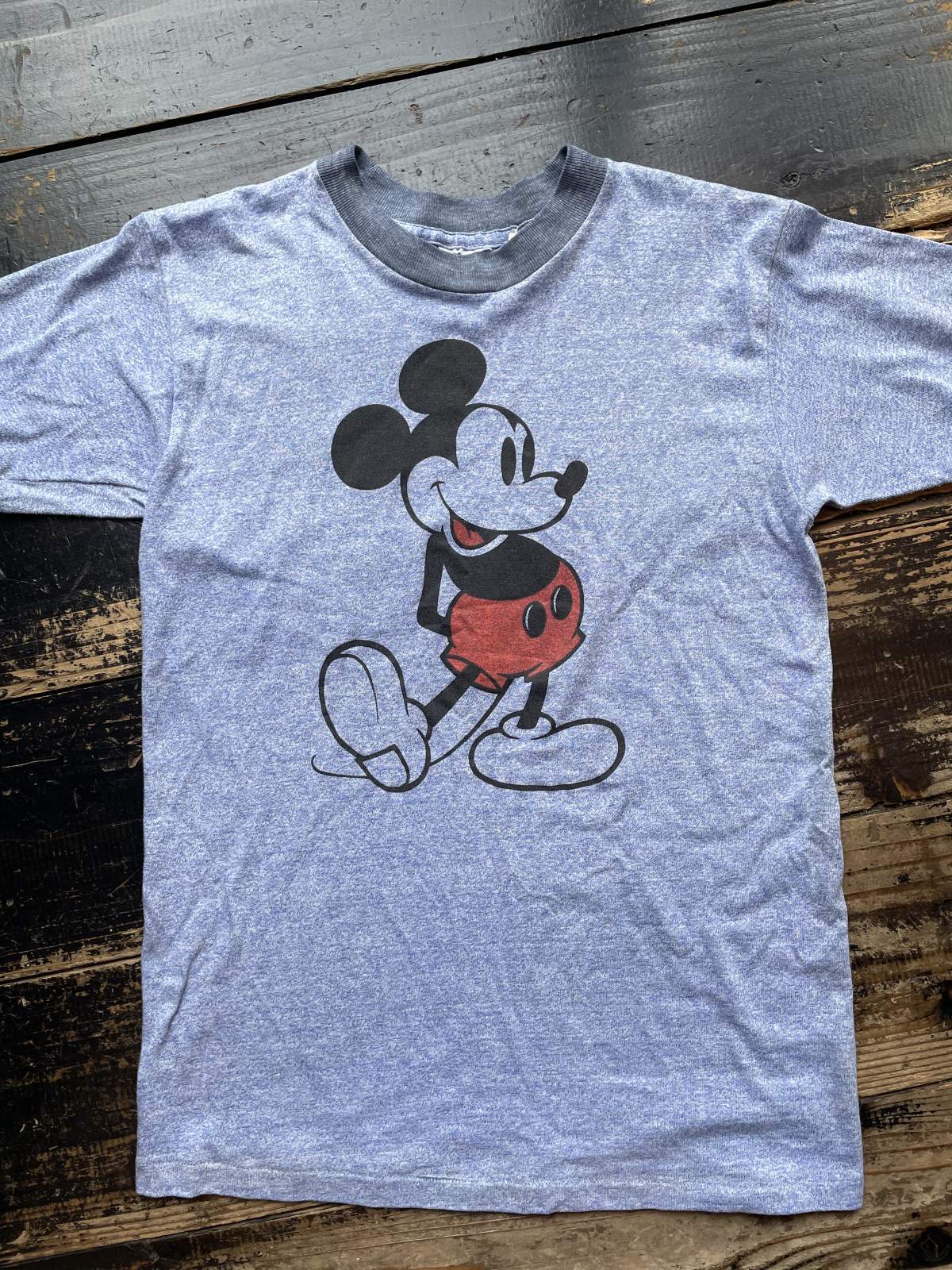 80年代位のミッキーマウスのリンガーTシャツ。タグはなくなっているので詳細不明 おそらくUSA製 素材はコットン×ポリエステルだと思います。色は薄いブルーの霜降り柄 プリントは油性 裾はシングルステッチ S位のサイズ感だと思います。シンプルなミッキーマウスのリンガーTシャツでレトロで可愛いと思います。