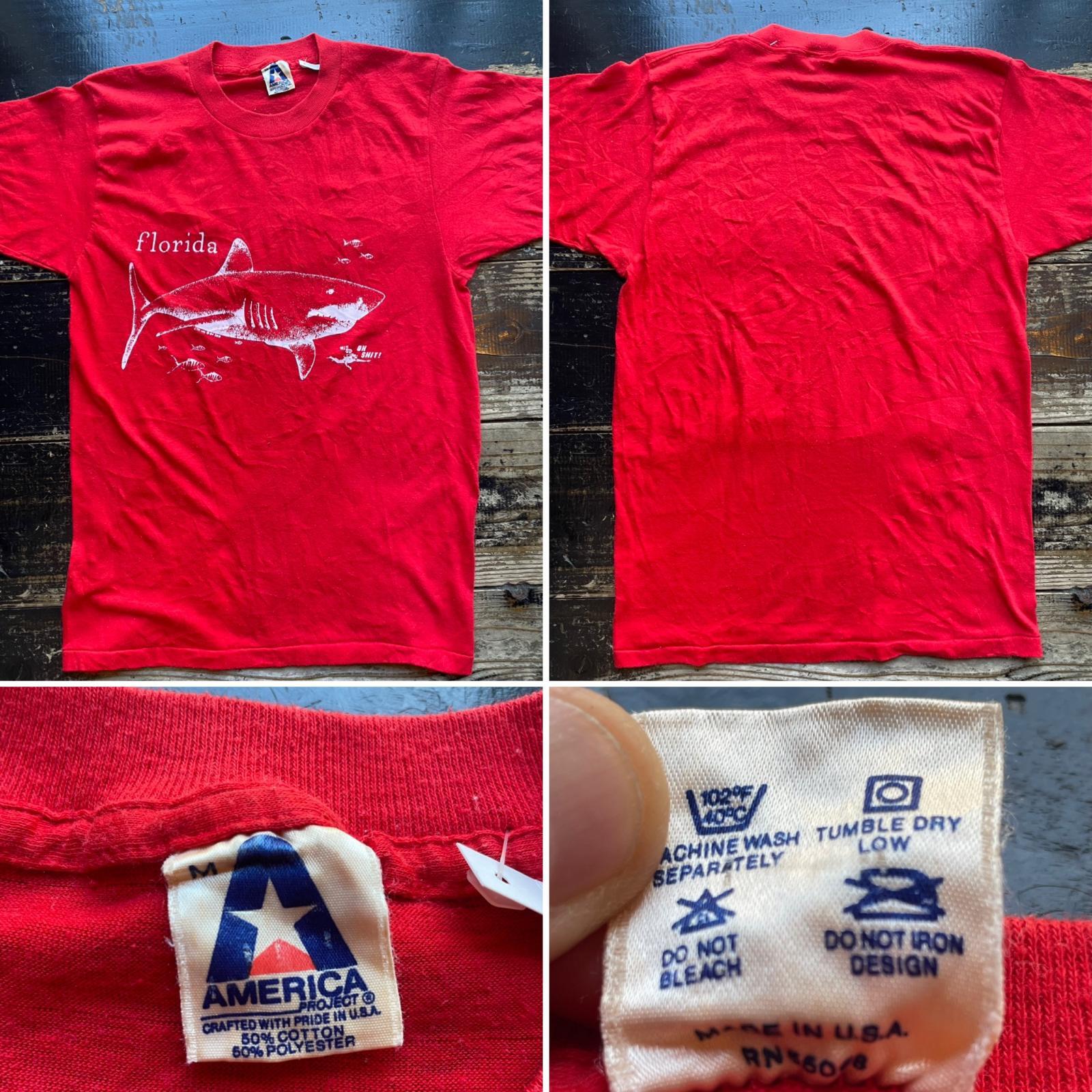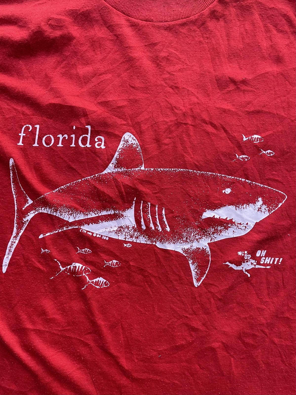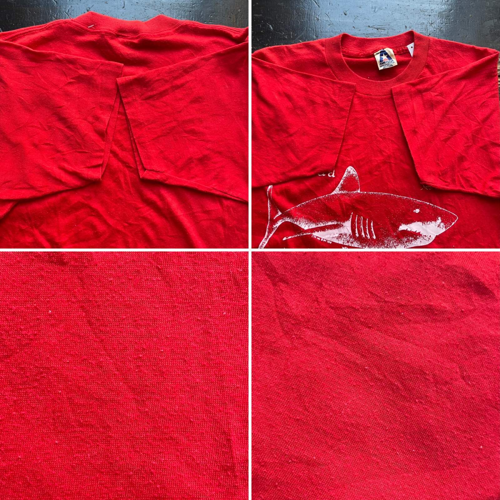 80年代位のサメのTシャツ USA製 素材はコットン×ポリエステル プリントは油性 袖と裾はシングルステッチ 古着らしいリアルなサメのプリントが格好良いと思います。