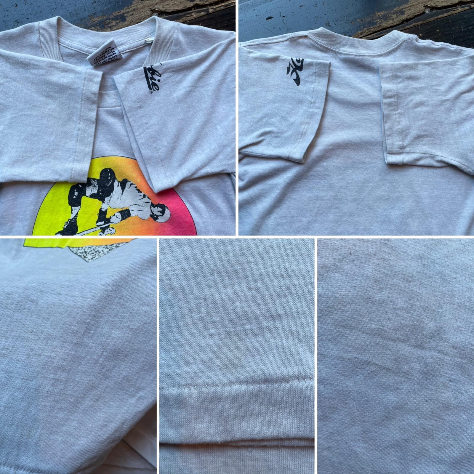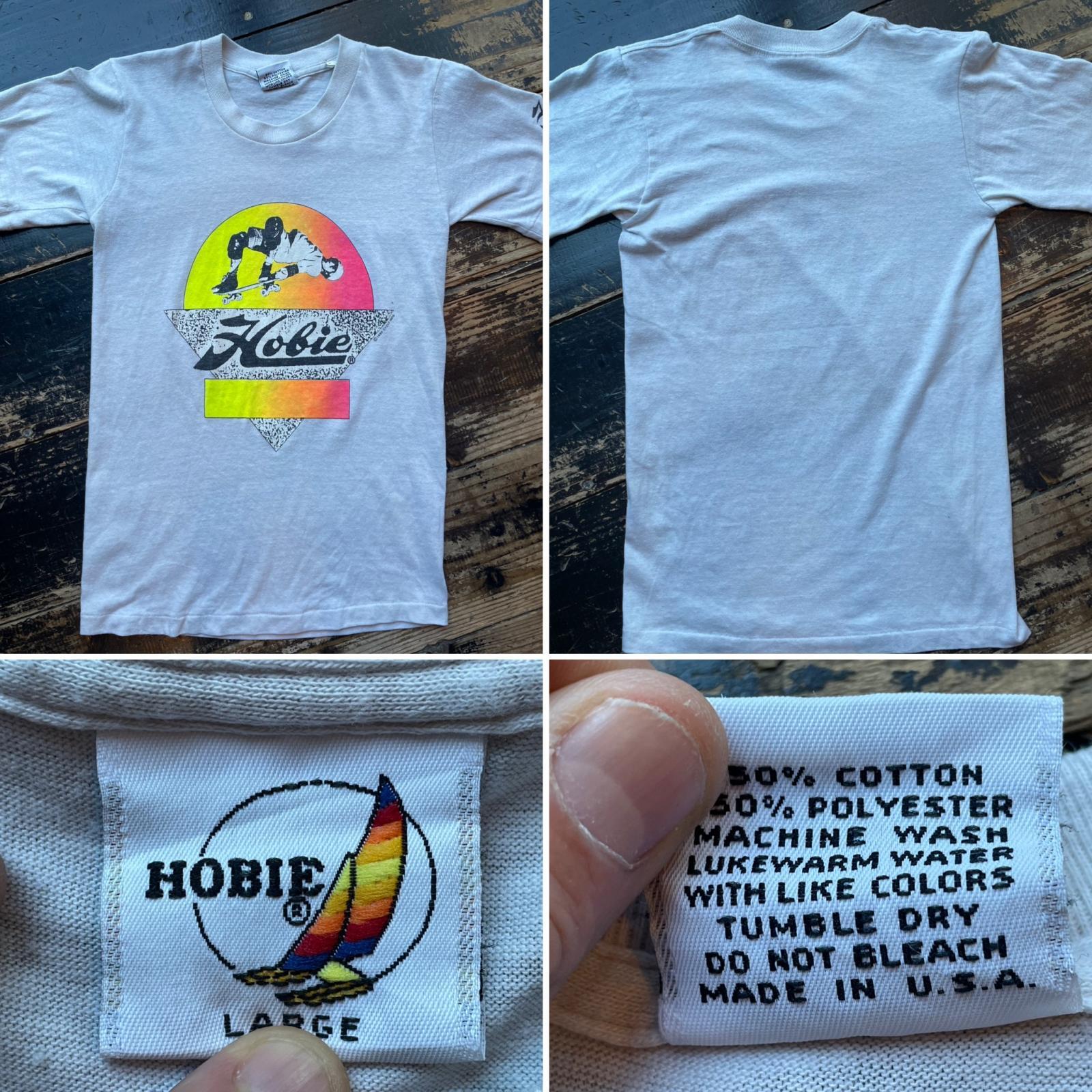 1990年のコピーライトの入ったHobieのTシャツ。USA製 素材はコットン×ポリエステル ボディカラーはライトグレーだと思います。プリントは油性 袖と裾はシングルステッチ サイズ小さいので女性が着ても良いと思います。レトロなプリントで格好良いと思います。