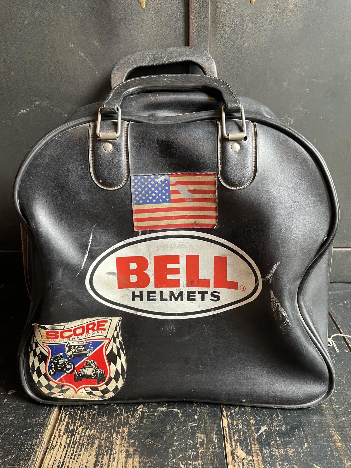 70年代のBELLのヘルメットバッグ タグ等なく詳細不明 素材は合皮 ジップはDANDY 両面に星条旗とSCORE INTERNATIONALのシールが貼られています。 普段使用しても良いですがガレージや部屋のインテリアに最適だと思います。