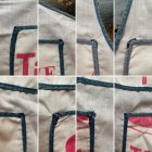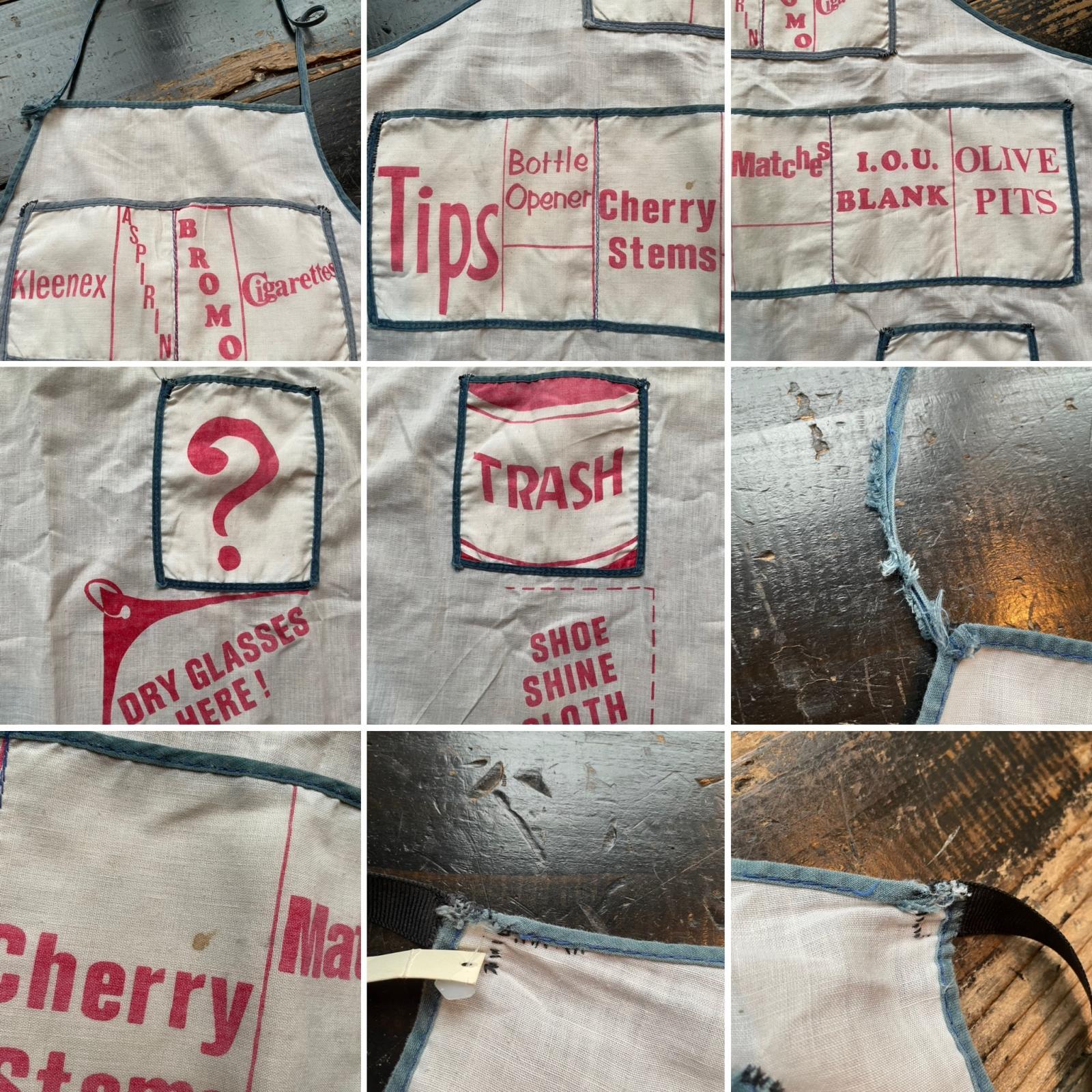 1960年代〜のたくさんポケットが付いているエプロン。タグはないので詳細不明 素材はコットン×ポリエステルだと思います。7つポケットあります。文字等は染み込みプリントです。デザイン良く壁に掛けて手紙等を入れる収納スペースとして飾ってもいいと思います。