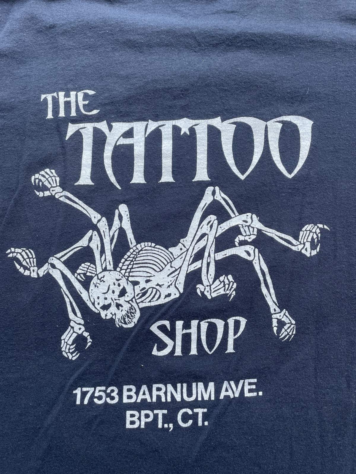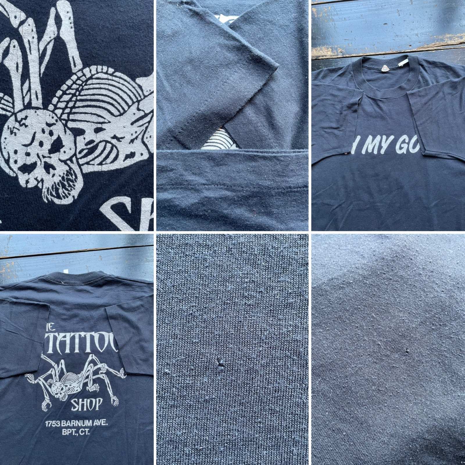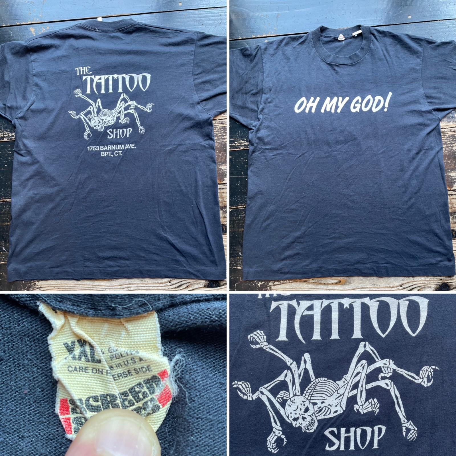 1980年代のタトゥーショップのTシャツ。ボディはSCREEN STARS USA製 素材はコットン×ポリエステル プリントは油性 袖と裾はシングルステッチオーマイゴットの文字に6本足の骸骨プリントが最高だと思います。