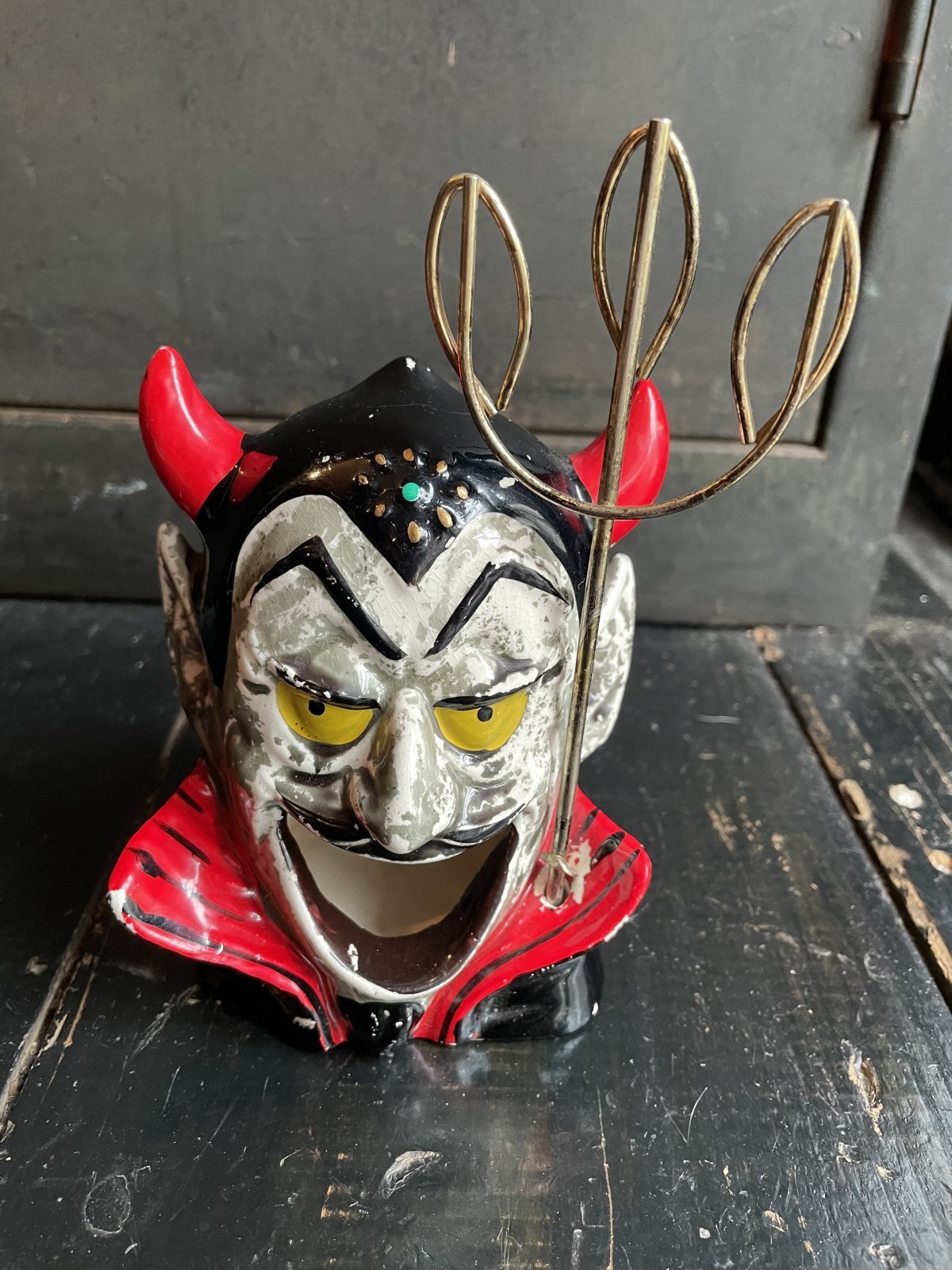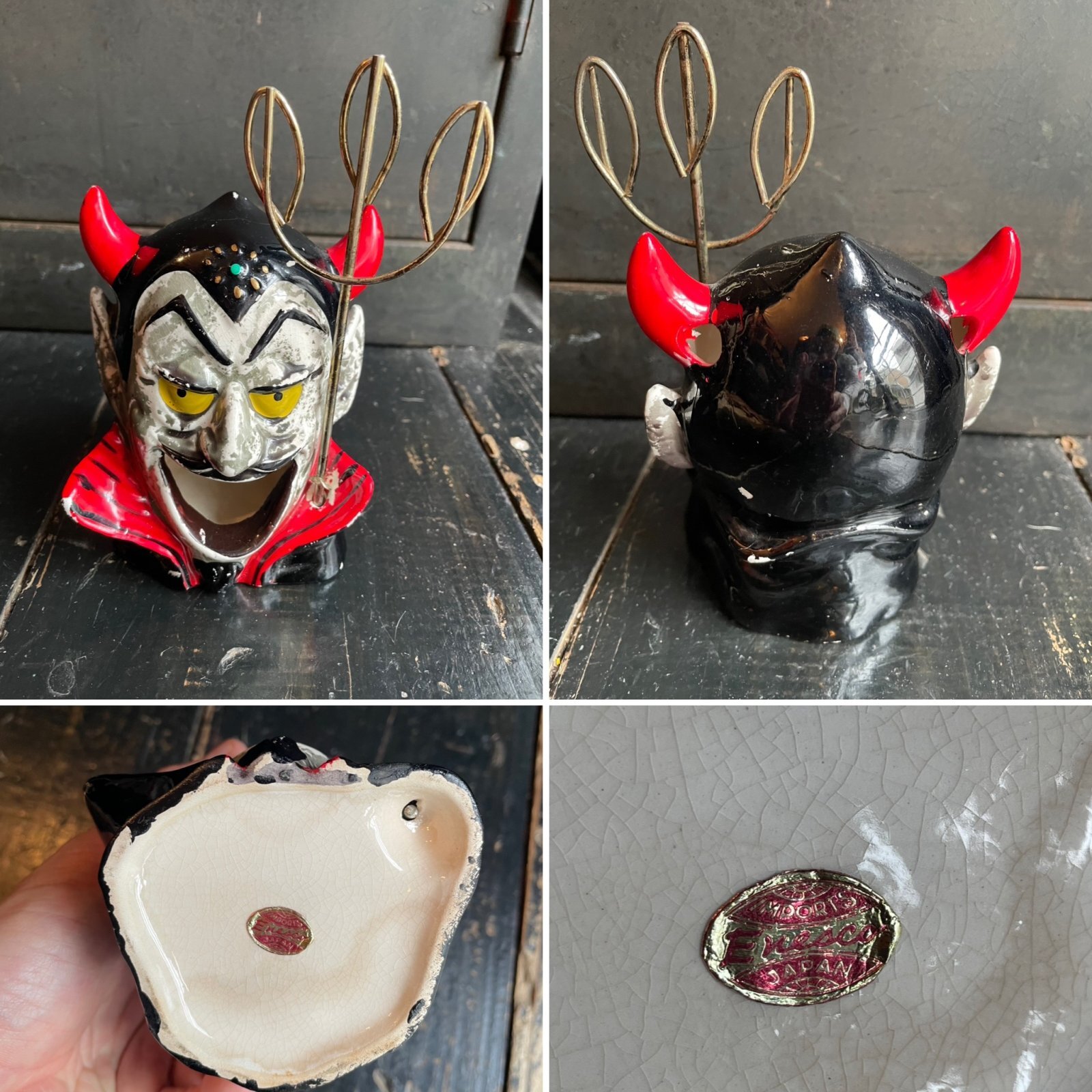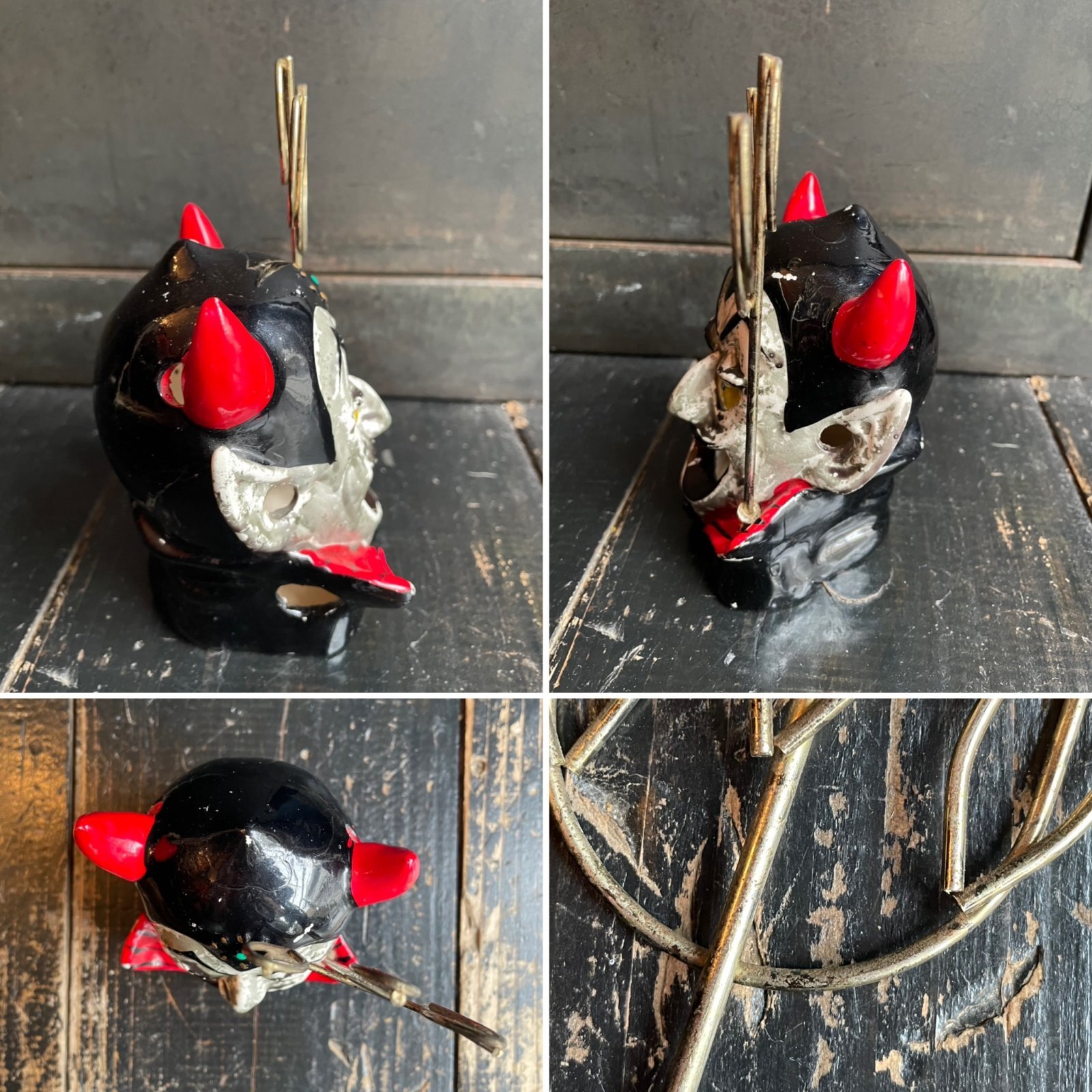 1950〜1960年代のデビルの灰皿。JAPAN製 素材は陶器 マッチを挟む鉄製の棒が付いてます。口にタバコを置くと煙が両耳と両角後ろから出る仕組みになります。ダメージ等ありますが棒も付いていてディスプレイ映えする灰皿だと思います。