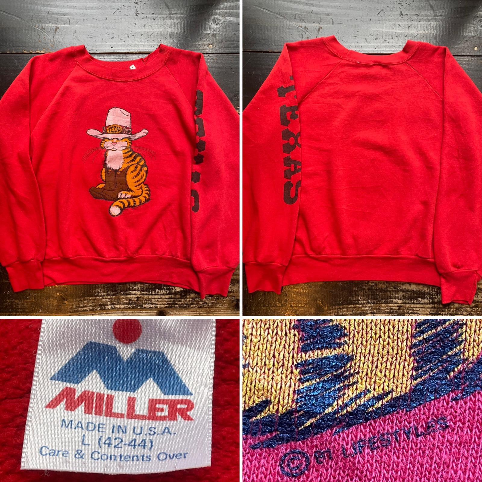 80年代位の猫のプリントのスウェット。USA製 素材はコットン×ポリエステル プリントは油性 字が潰れて読めないですがコピーライト入ってます。左袖アームにTEXASとプリント入ってます。サイズ表記Lですが縮んで着丈短めなのでS〜M位のサイズ感だと思います。テンガロンハットにウエスタンブーツのふてぶてしいネコのプリントが良く袖のプリントもアクセントになって良いと思います。