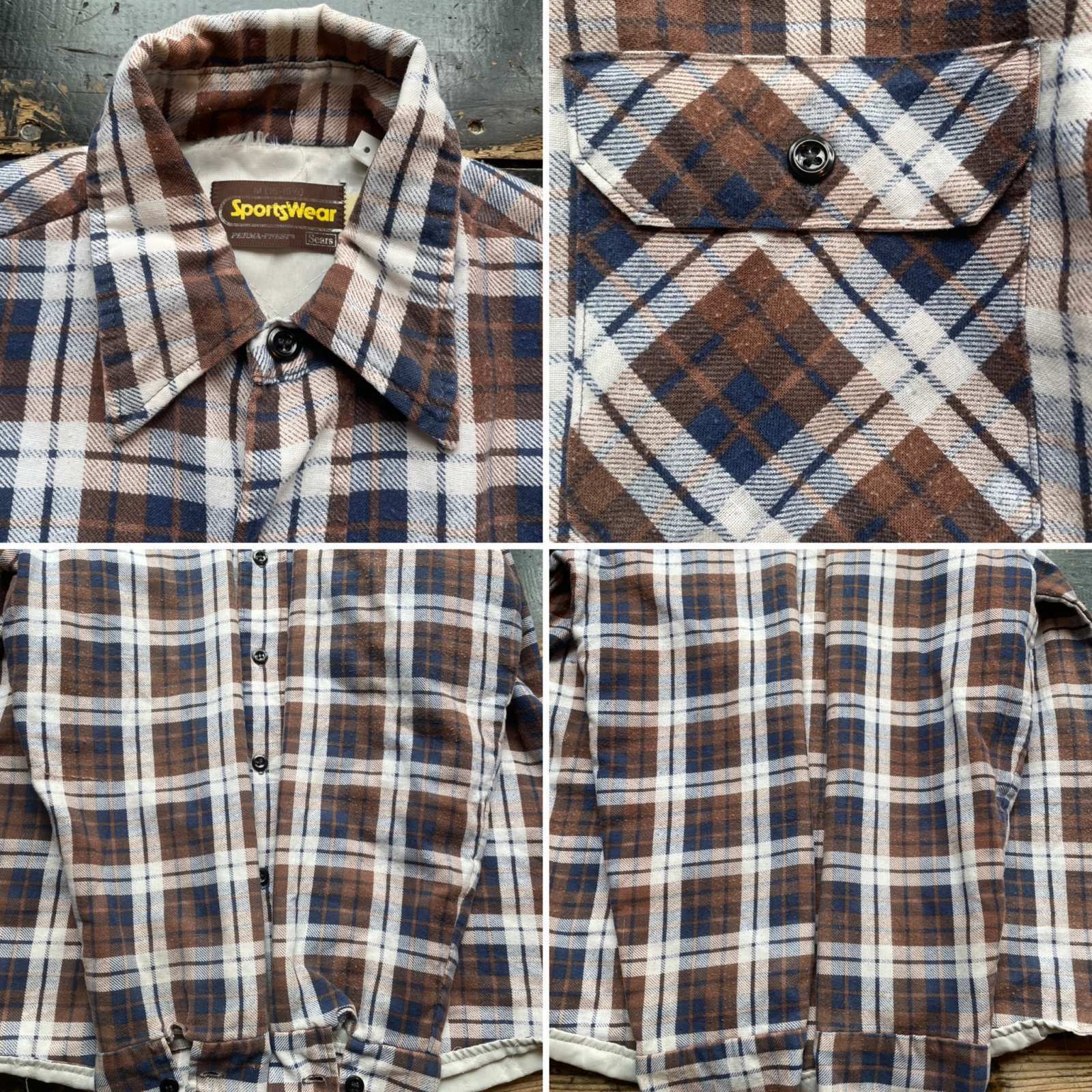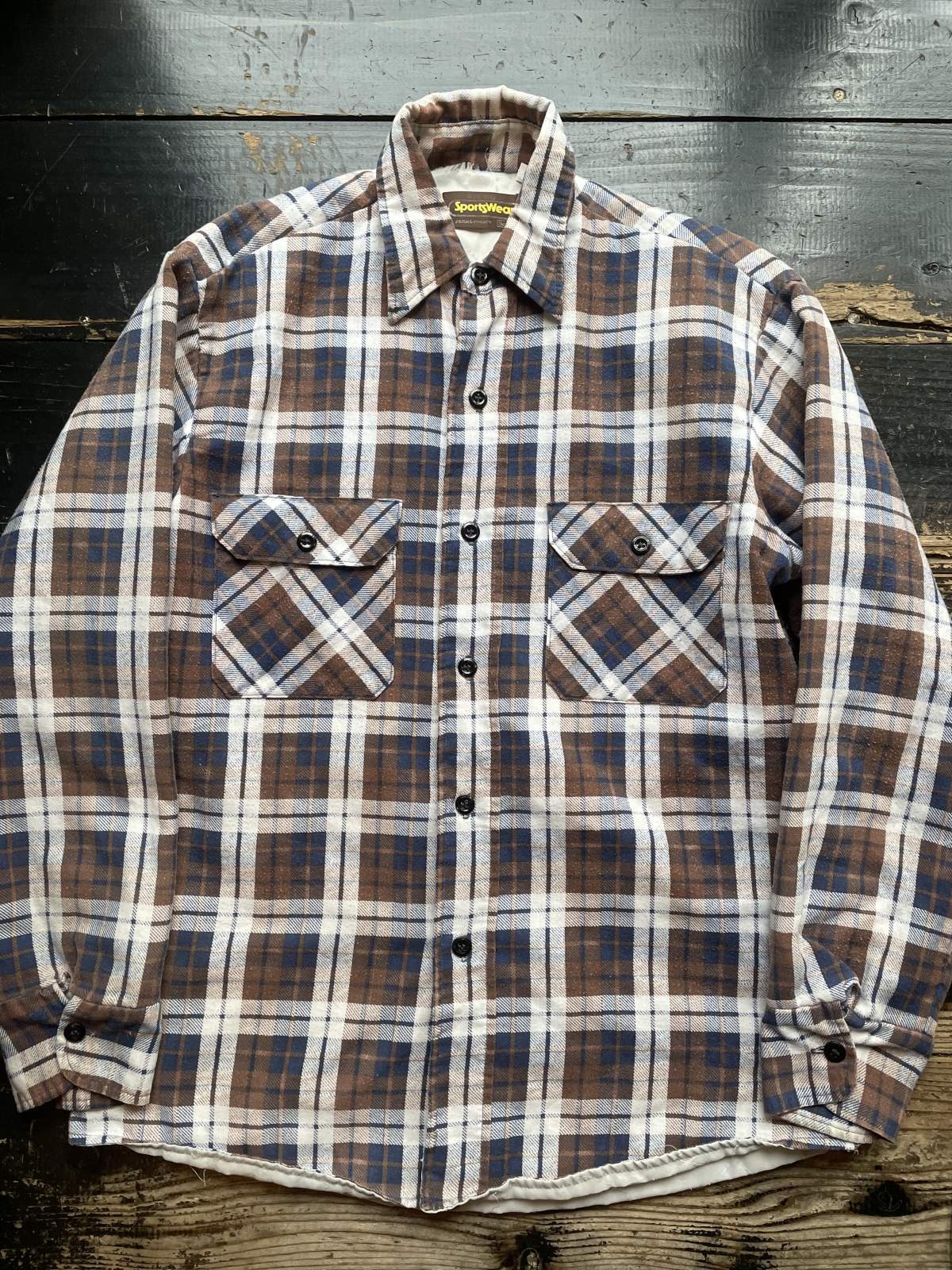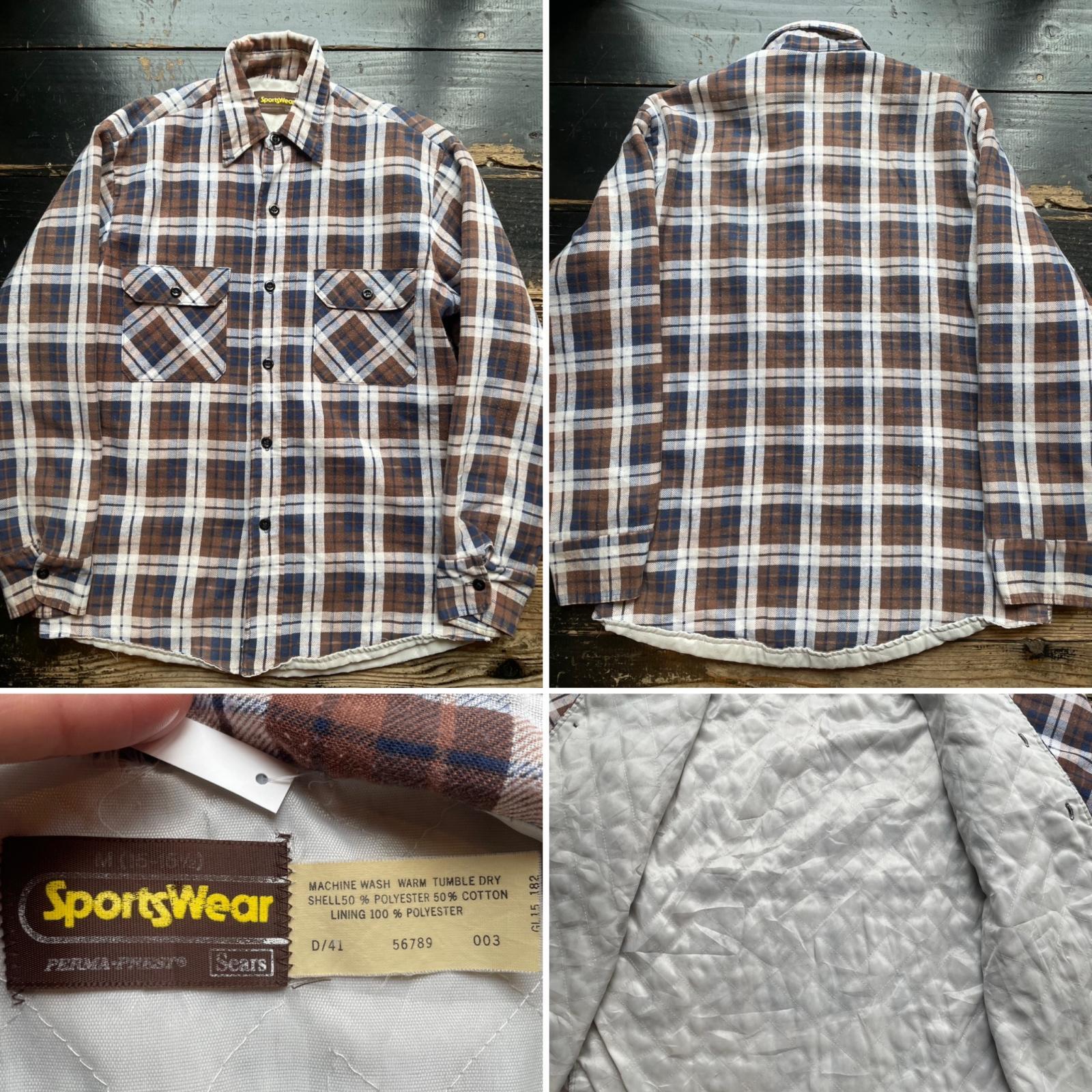 80年代位のライニングがキルティング素材のライトネルシャツ。ブランドはSears sportswear 生産国不明 素材は表はコットン×ポリエステル ライニングはポリエステル ボタンは同じ物が揃ってます。 古着らしい良い配色のチェック柄で雰囲気あるネルシャツだと思います。
