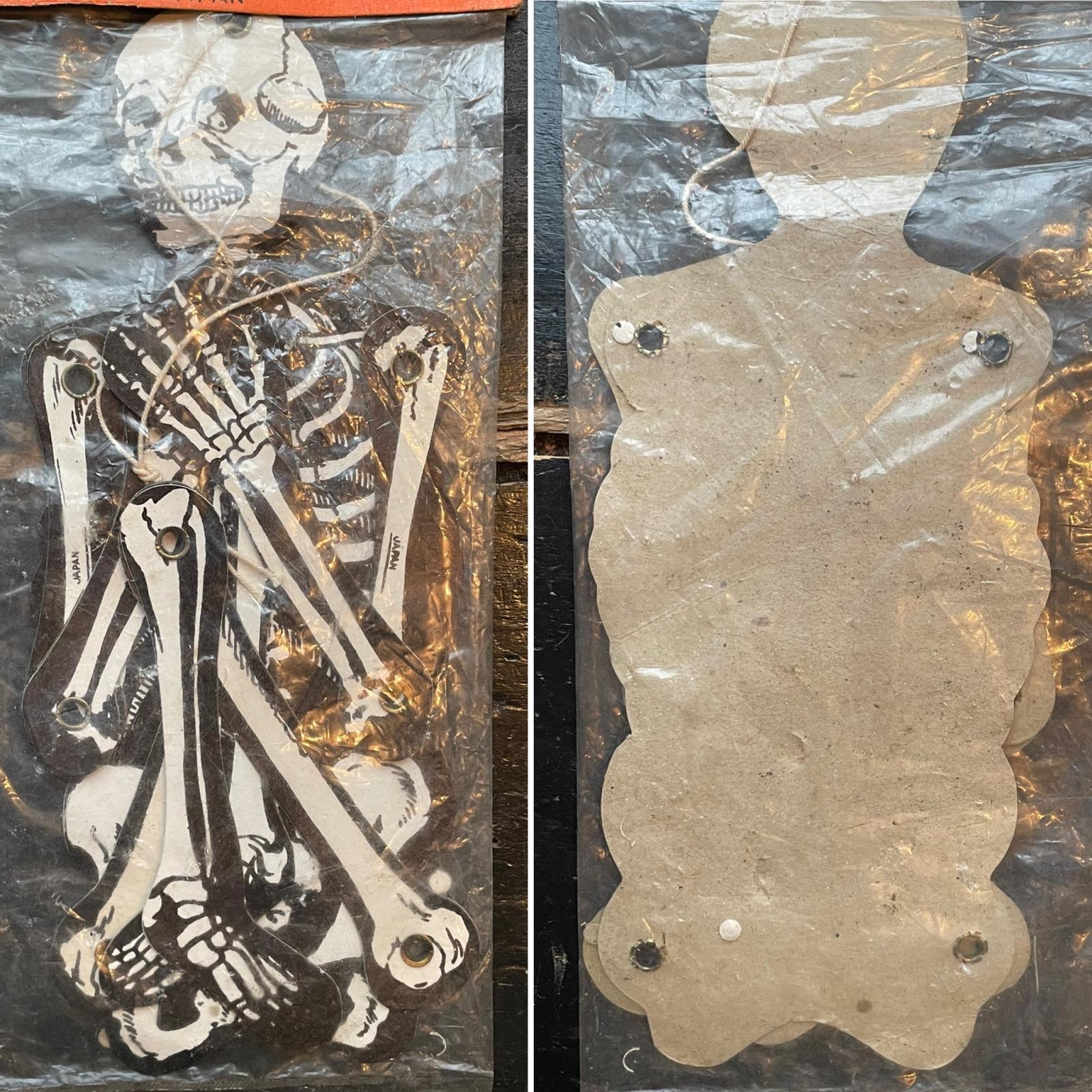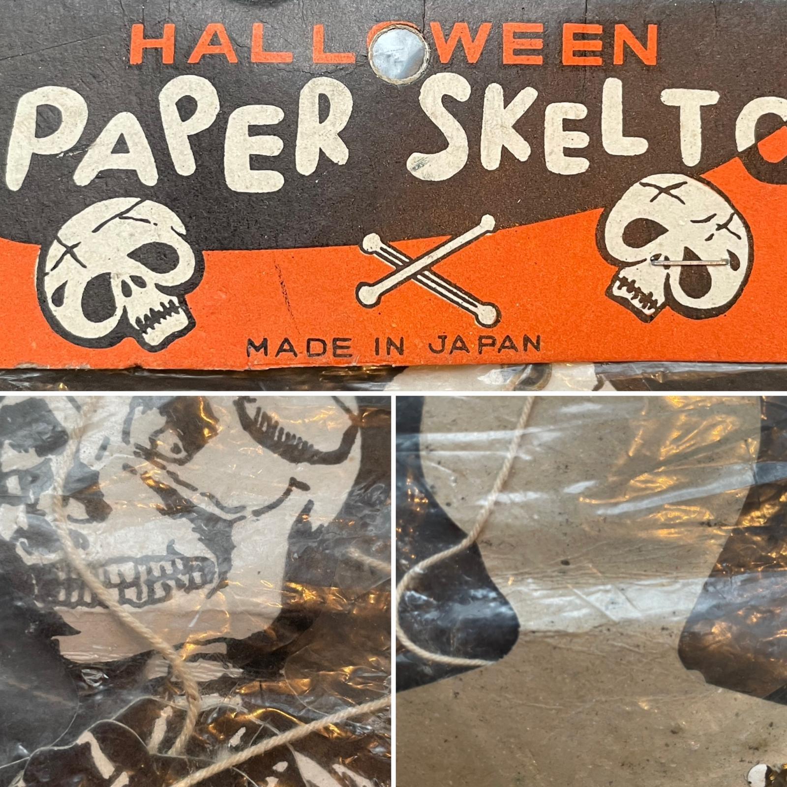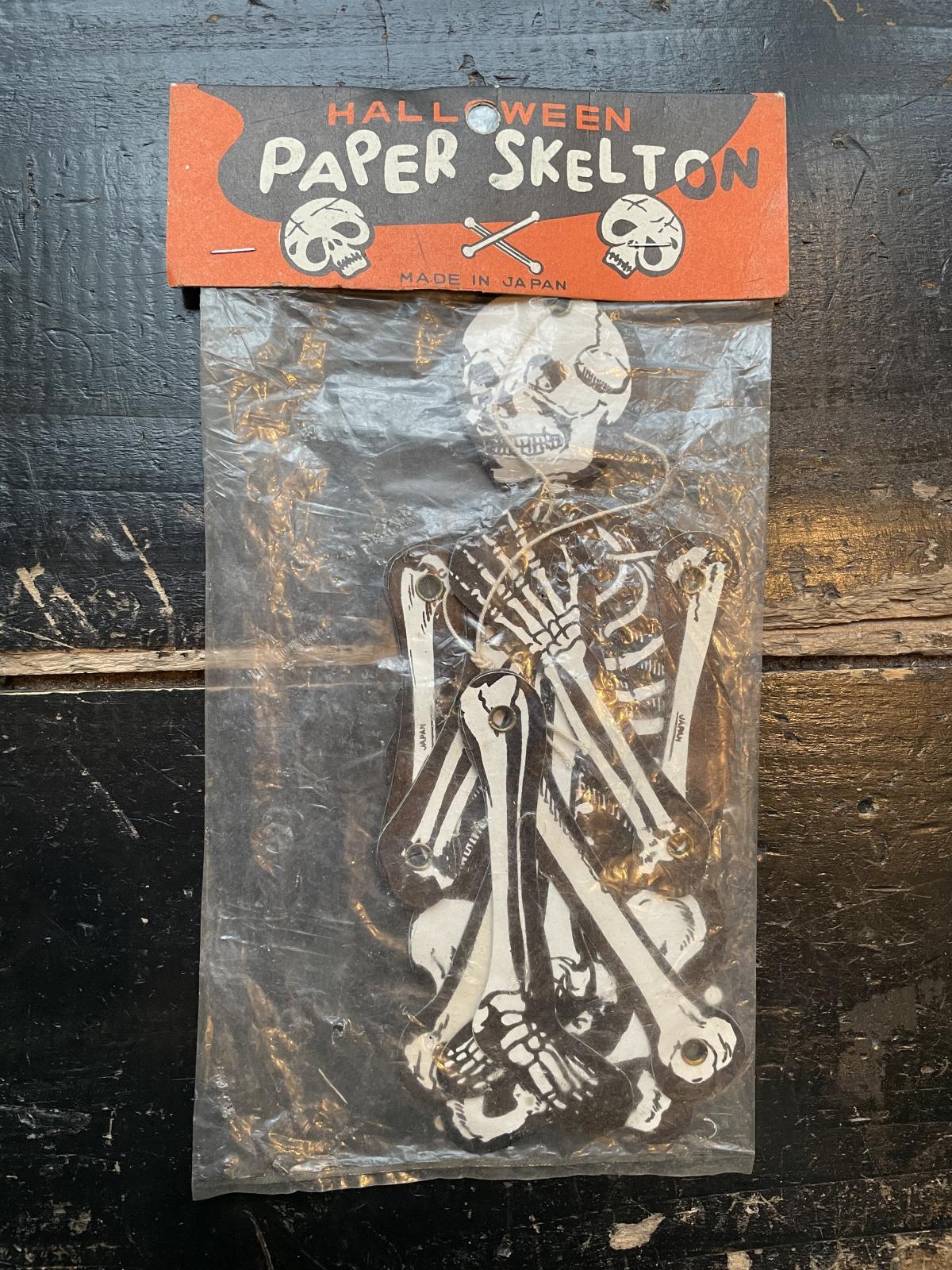 1960年代の紙製の骸骨の壁掛け。紙ラベル付き袋入りです。JAPAN製 首折れてますが紙ラベルのデザインも良くディスプレイに良いと思います。