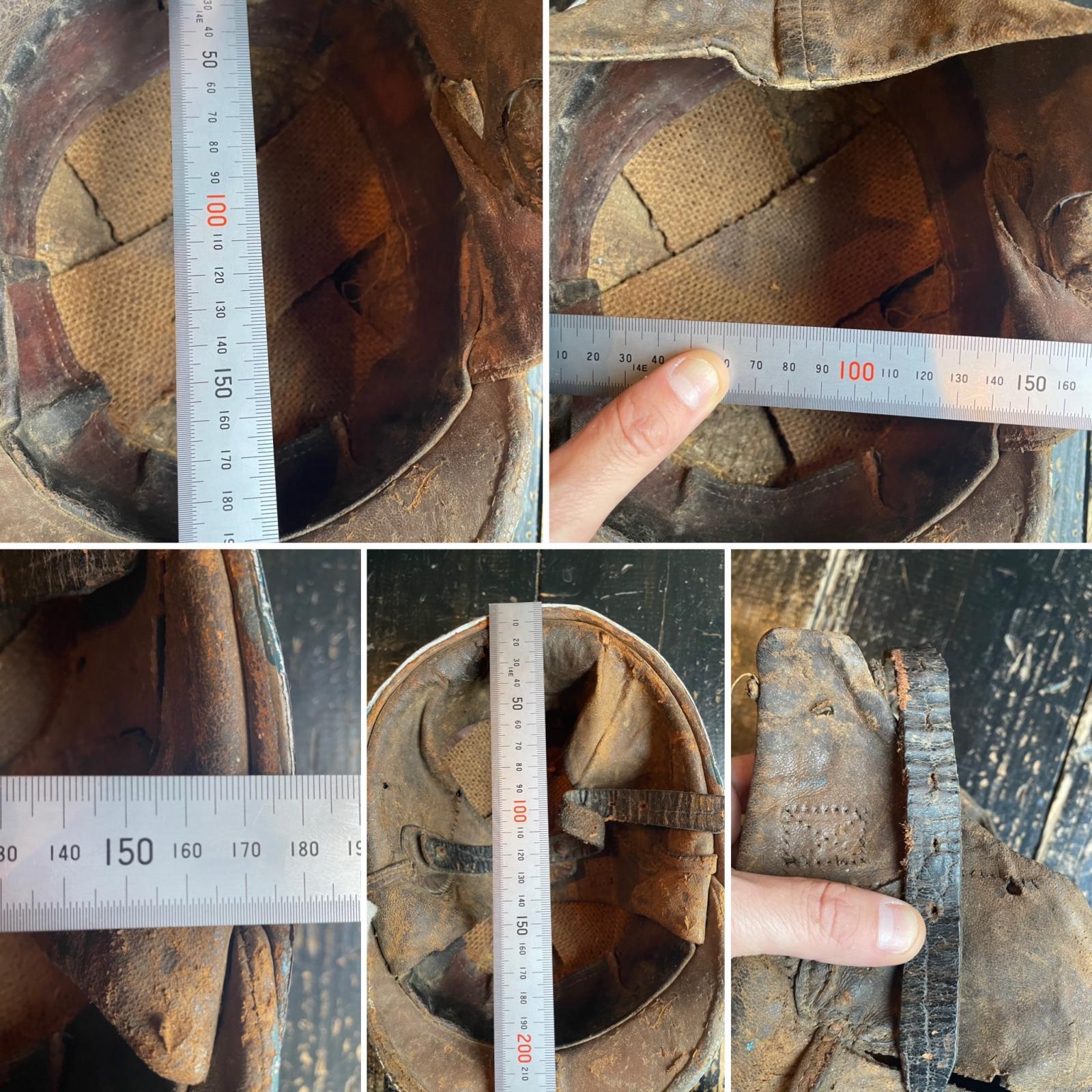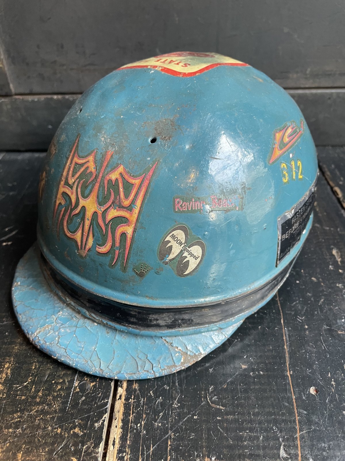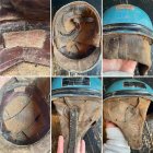 1950〜1960年代のバイクの吊り天仕様のヘルメット タグはありますが文字消えかかってブランドや生産国不明 ヘルメット内側と耳あてはレザーでカビ臭くダメージや耳あての金具が欠品してるので使用にはむかないです。ヘルメットにデカールがたくさん貼ってあります。かなり小さいサイズだと思います。ダメージ多々ありカビ臭く資料やディスプレイ向きだと思います。ダメージ多々ありサイズ小さいですが飾りには雰囲気あって最高だと思います。