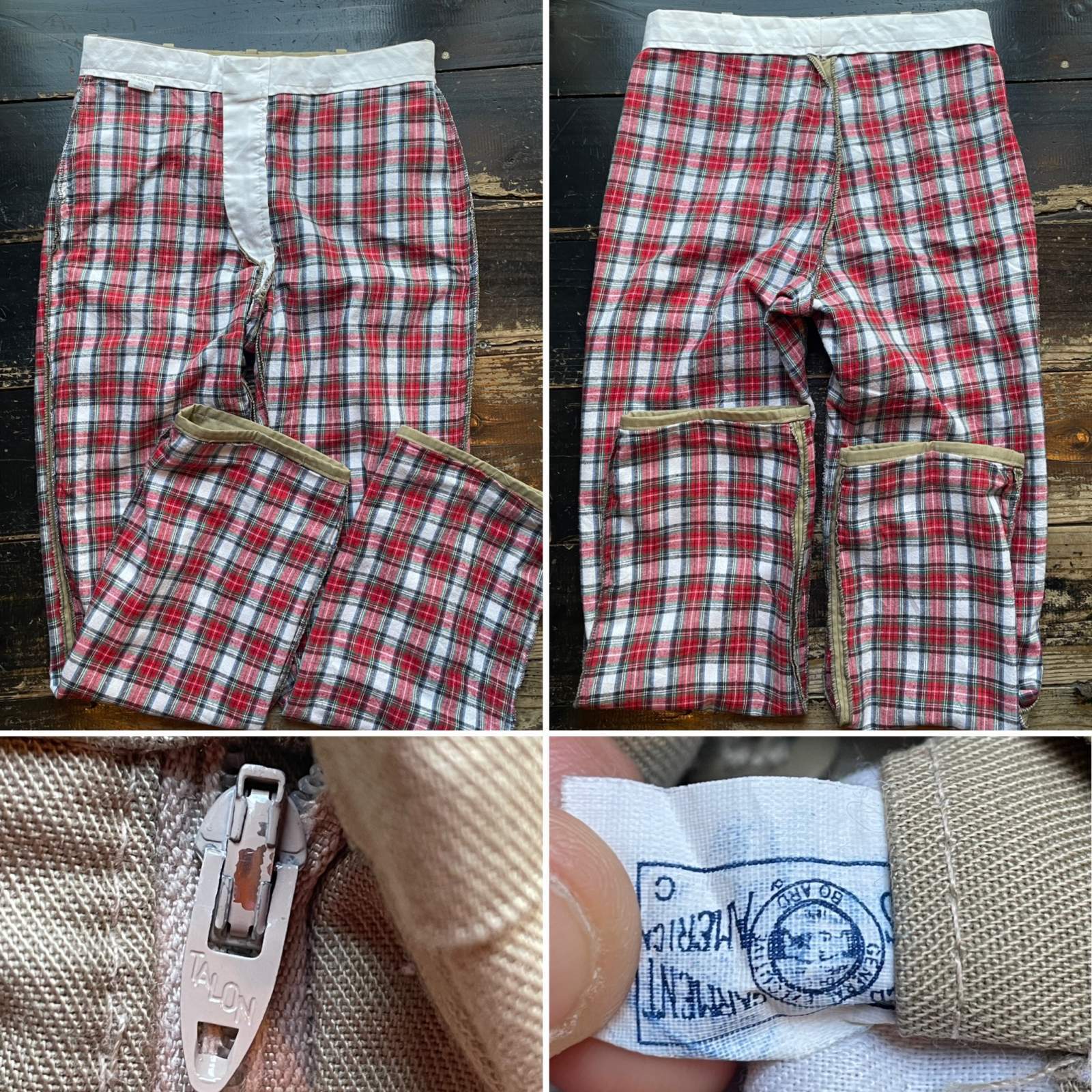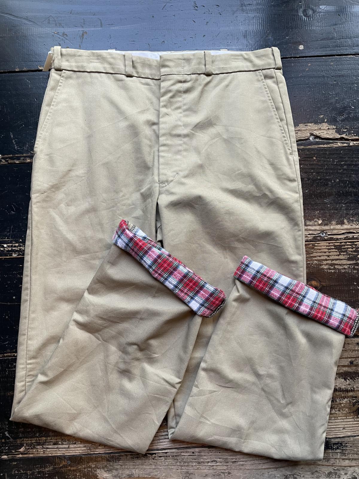80年代位のオシュコシュのライニングがネル素材のワークパンツ。USA製 素材は65%ポリエステル 35%コットン ジップはTALON 後ろ左ポケット内側にユニオンチケット付いてます。裾折り返すとネルが見えて可愛いです。ライニングにライトネル素材を使用されているのでバイク乗りの方にもいいと思います。