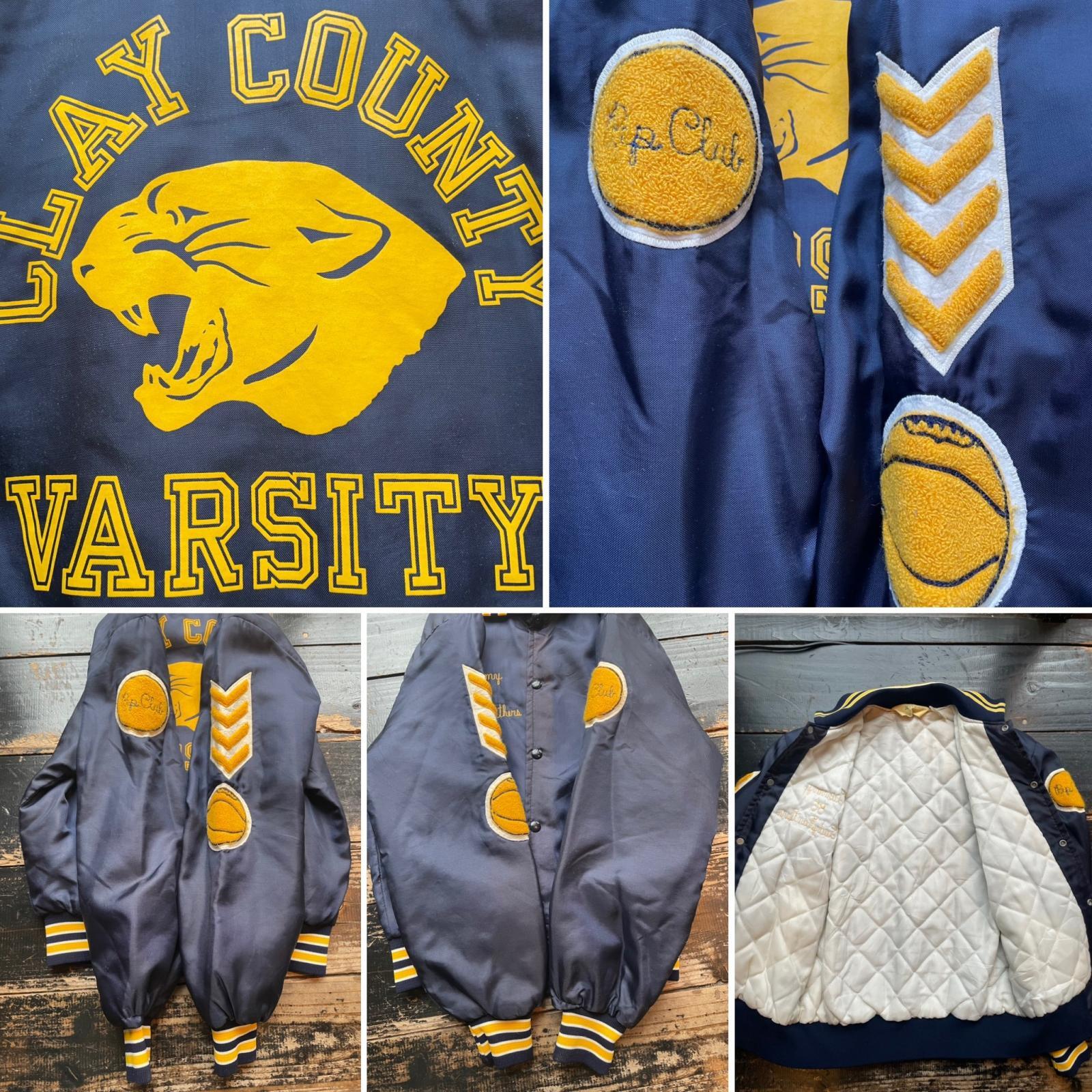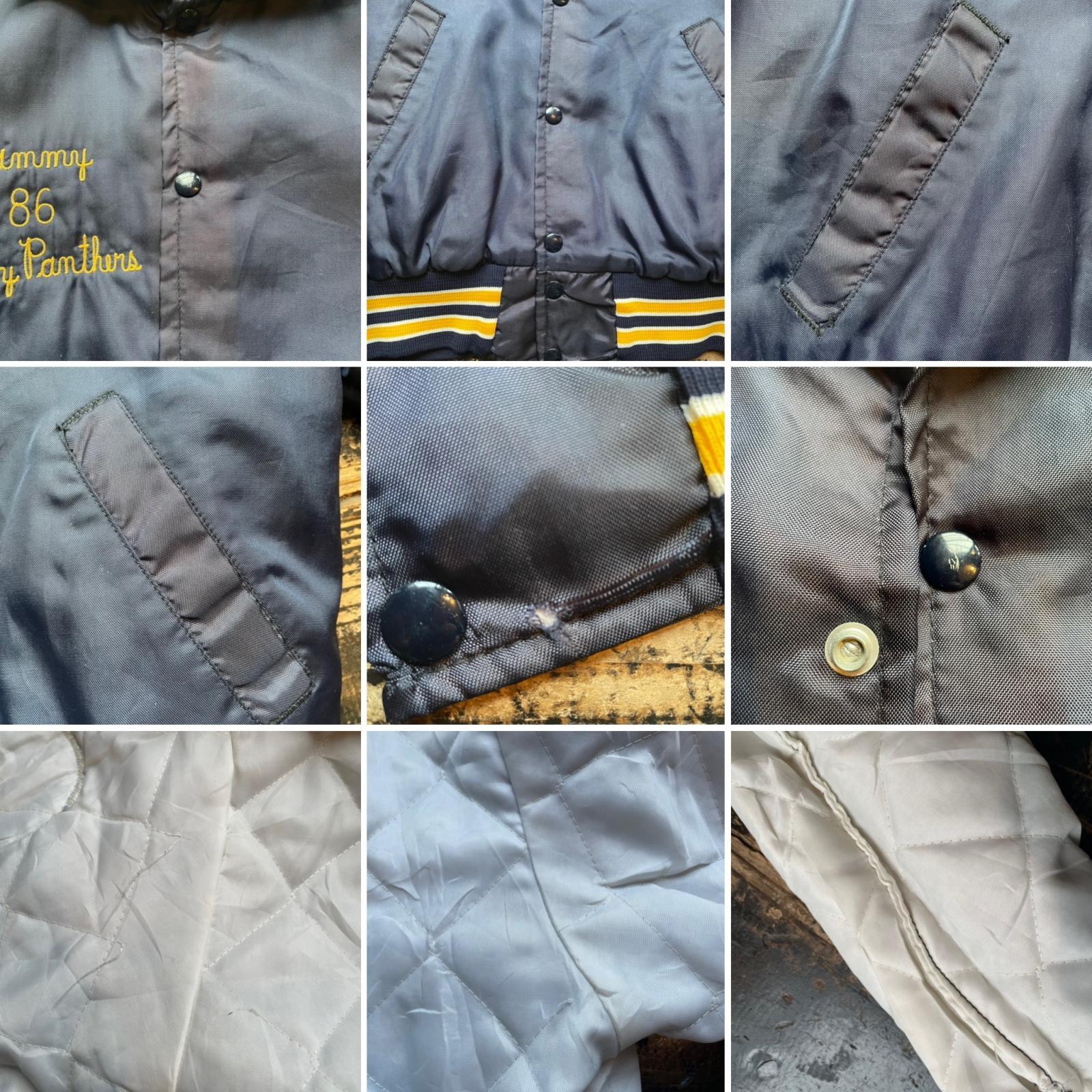 80年代のCLAY COUNTY高校のフットボールチームのナイロンジャケットだと思います。USA製 素材はナイロン ボタンはスナップボタン ライニングはポリエステルのキルティングだと思います。右胸にチェーンステッチ 右袖に2個 左袖に1個シニールパッチが付いてます。背中のプリントはラバープリント チェーンステッチに両袖パッチの背中にパンサーのプリント入り豪華で格好良いです!サイズ小さいので女性にも良いと思います。