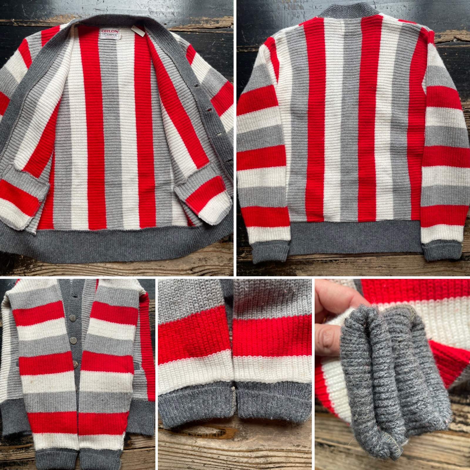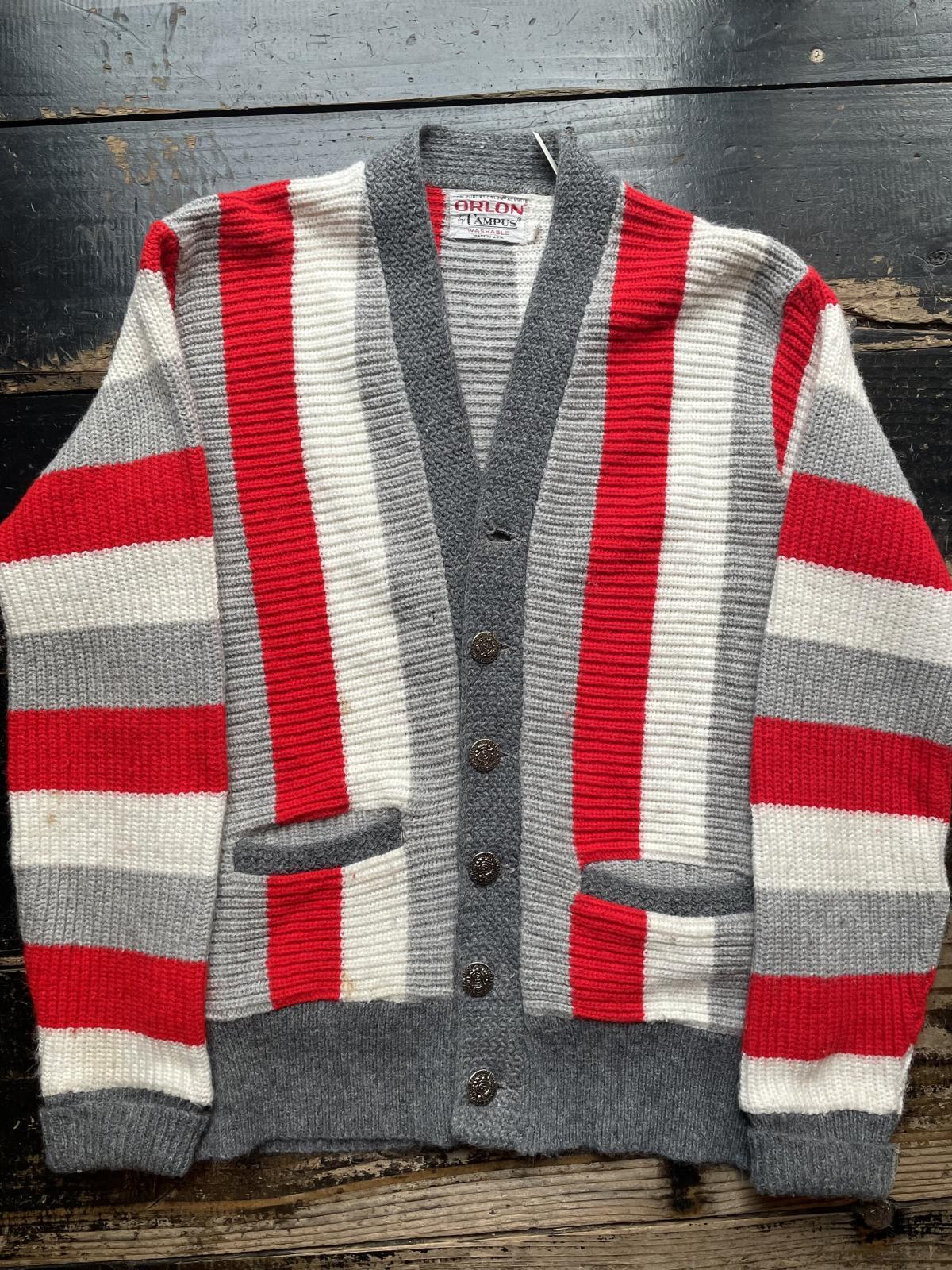 1960年代〜のストライプ柄のアクリルカーディガン。ブランドはORLON by CAMPUS 素材は厚手のアクリル ボタンは1つ欠品しています。 ボーイズサイズなのでサイズ小さいですが色 柄良く格好良いカーディガンだと思います。サイズ小さいので女性にも良いと思います。